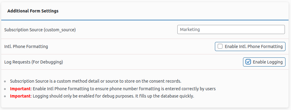 The plugin has a logging feature that can be enabled from the Additional Form Settings section. It is not recommended to enable logging on a production site. every request to Klaviyo is logged and as a result will quickly increase the size of the database table. This can lead to performance issues if left enabled for a long time.